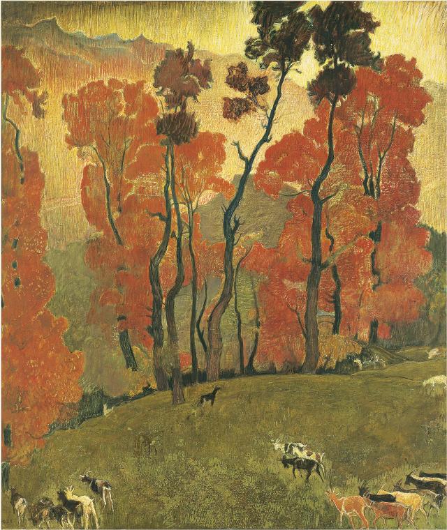 Bien qu’au moyen d’une palette aux accents plus terreux, Édouard Vallet (1876-1929) valorise à son tour la force expressive des couches picturales distinctes, tandis qu’Ernest Biéler (1863-1948) choisit la tempera pour styliser les motifs naturels et encourager des jeux de transparences et de coloris dans ses retranscriptions de paysages automnaux de la région de Savièse.